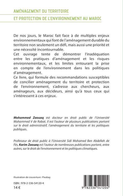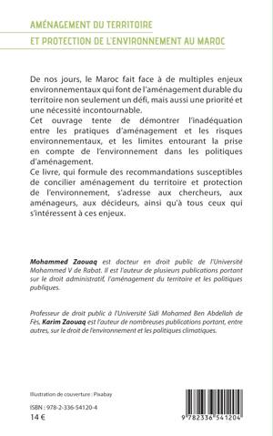 De nos jours, le Maroc fait face à de multiples enjeux environnementaux qui font de l'aménagement durable du territoire non seulement un défi, mais aussi une priorité et une nécessité incontournable. Cet ouvrage tente de démontrer l'inadéquation entre les pratiques d'aménagement et les risques environnementaux, et les limites entourant la prise en compte de l'environnement dans les politiques d'aménagement. Ce livre qui met en avant des recommandations qui sauraient concilier l'aménagement du territoire avec l'environnement, s'adresse aux chercheurs, aux aménageurs, aux décideurs, ainsi qu'à tous les lecteurs qui s'intéressent à la protection de l'environnement et à l'aménagement du territoire.