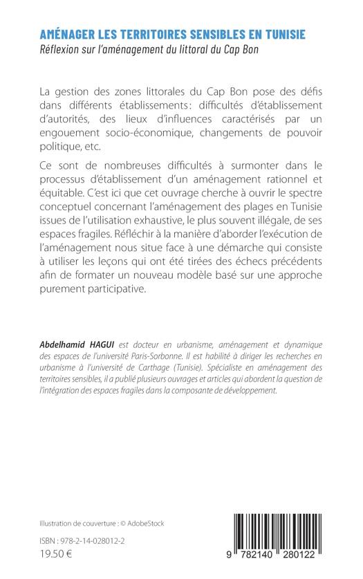 La gestion des zones littorales du Cap Bon pose des défis dans différents établissements: difficultés d'établissement d'autorités, des lieux d'influences caractérisés par un engouement socio-économique, changements de pouvoir politique, etc. Ce sont de nombreuses difficultés à surmonter dans le processus d'établissement d'un aménagement rationnel et équitable. C'est ici que cet ouvrage cherche à ouvrir le spectre conceptuel concernant l'aménagement des plages en Tunisie issues de l'utilisation exhaustive, le plus souvent illégale, de ses espaces fragiles. Réfléchir à la manière d'aborder l'exécution de l'aménagement nous situe face à une démarche qui consiste à utiliser les leçons qui ont été tirées des échecs précédents afin de formater un nouveau modèle basé sur une approche purement participative.