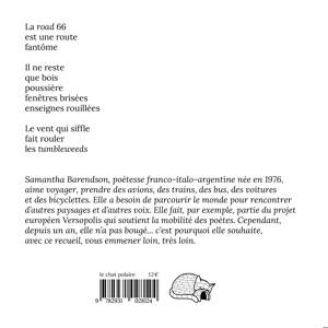 En juillet 2019, Samantha Barendson effectue un road-trip aux États-Unis. Comme elle n'a pas le permis de conduire, son compagnon prend le volant pendant les 5000 kilomètres qui séparent La Nouvelle-Orléans de San Francisco. Samantha Barendson regarde la route, les paysages et l'immensité défiler devant ses yeux. Elle prend des notes dans un carnet à spirales, capture des images sur son appareil photo et grave des souvenirs dans sa mémoire. Le recueil poétique Americans don't walk. Les Américains ne marchent pas roule dès lors en road-poem, à l'image de cet incroyable voyage.