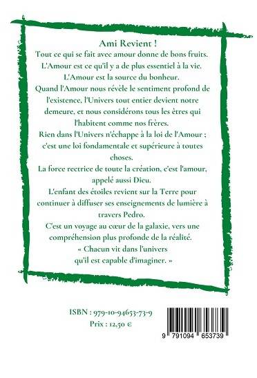 Ami Revient ! Tout ce qui se fait avec amour donne de bons fruits. L'Amour est ce qu'il y a de plus essentiel à la vie. L'Amour est la source du bonheur. Quand l'Amour nous révèle le sentiment profond de l'existence, l'Univers tout entier devient notre demeure, et nous considérons tous les êtres qui l'habitent comme nos frères. Rien dans l'Univers n'échappe à la loi de l'Amour ;c'est une loi fondamentale et supérieure à toutes choses. La force rectrice de toute la création, c'est l'amour,appelé aussi Dieu. L'enfant des étoiles revient sur la Terre pour continuer à diffuser ses enseignements de lumière à travers Pedro. C'est un voyage au cœur de la galaxie, vers une compréhension plus profonde de la réalité. « Chacun vit dans l'univers qu'il est capable d'imaginer. »