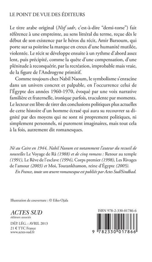 Le titre arabe original («Nisf sadr», c'est-à-dire "demi-torse") fait référence à une empreinte, au sens littéral du terme, reçue dès le début de son existence par le héros du récit, Amir Barsoum, qui porte sur sa poitrine la marque en creux d'une humanité mutilée, violentée. Le récit se développe ensuite à un rythme d'abord assez lent, puis précipité, comme la quête d'une compensation, d'une plénitude à reconquérir, par la recréation, improbable mais vraie, de la figure de l'Androgyne primitif.