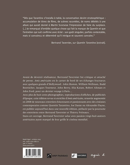 "«C'est peu dire que cet ouvrage place le travail d'historien du cinéma à un niveau que l'on côtoie rarement. La recherche effectuée durant cinq décennies est considérable."» «Le Monde», décembre 2008. Salué par l'ensemble de la critique, cinéphiles et passionnés de cinéma, le livre monumental de Bertrand Tavernier a connu un succès fulgurant tant par la densité de son contenu que par la ferveur avec laquelle Bertrand Tavernier s'entretient avec ces cinéastes américains mythiques, oubliés, adulés ou «blacklistés». Ressorti augmenté de nouveaux entretiens en 2008, il ressort aujourd'hui dans une nouvelle édition en version «paperback», préfacé par la poursuite des entretiens entre Bertrand Tavernier et Thierry Frémaux, qui est l'éditeur de cet ouvrage. Exploration passionnée au coeur même de la création, mais aussi reflet d'une manière de vivre la cinéphilie, «Amis américains» est un livre album qui offre l'autopsie méticuleuse et fragmentée du cinéma américain de 1945 à nos jours et le bilan des années cinéphiles du futur cinéaste Tavernier.« "Être attaché de presse était une manière de continuer un travail de critique et d'historien du cinéma. Nous ne choisissions que des films que nous aimions."» Avec plus de 400 photos, «Amis Américains» reprend des entretiens effectués pour le compte de différentes revues par Bertrand Tavernier, carnet de bord du critique et attaché de presse qu'il fut. Échanges fructueux avec quelques grands d'Hollywood : John Ford, pour un dernier voyage à Paris, William Wellman, Budd Boetticher, John Huston, Jacques Tourneur, John Berry, Elia Kazan, Robert Altman... mais aussi dialogues foisonnants et passionnants avec les grands cinéastes américains actuels : Quentin Tarantino, Joe Dante ou Alexander Payne. Au total, Bertrand Tavernier salue avec passion vingt-huit auteurs ayant marqué de leur griffe le cinéma mondial. Prix 1993 du meilleur livre français sur le cinéma attribué par le Syndicat français de la Critique.