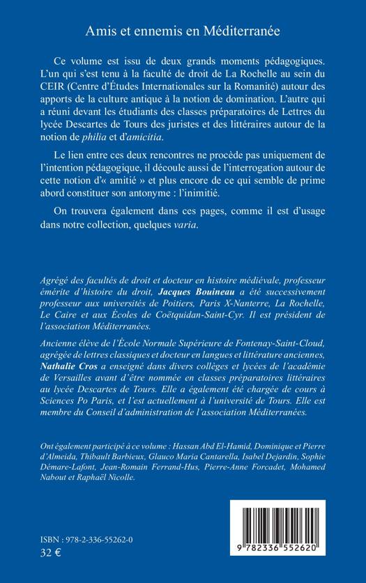 Ce volume est issu de deux grands moments pédagogiques. L'un qui s'est tenu à la faculté de droit de La Rochelle au sein du CEIR (Centre d'Études Internationales sur la Romanité) autour des apports de la culture antique à la notion de domination. L'autre qui a réuni devant les étudiants des classes préparatoires de Lettres du lycée Descartes de Tours des juristes et des littéraires autour de la notion de philia et d'amicitia. Le lien entre ces deux rencontres ne procède pas uniquement de l'intention pédagogique, il découle aussi de l'interrogation autour de cette notion d' amitié et plus encore de ce qui semble de prime abord constituer son antonyme: l'inimitié. On trouvera également dans ces pages, comme il est d'usage dans notre collection, quelques varia.