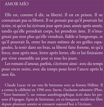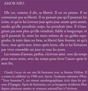 Claude Lucas vit sur une île bretonne avec sa femme Hélène. Il a connu la célébrité en 1996 avec Suerte, l? exclusion volontaire (Plon, ?Terre humaine?), un roman autobiographique écrit dans les prisons d?Espagne. Epris de littérature, cet ex-braqueur récidiviste libre depuis plusieurs années se consacre aujourd?hui à l?écriture.