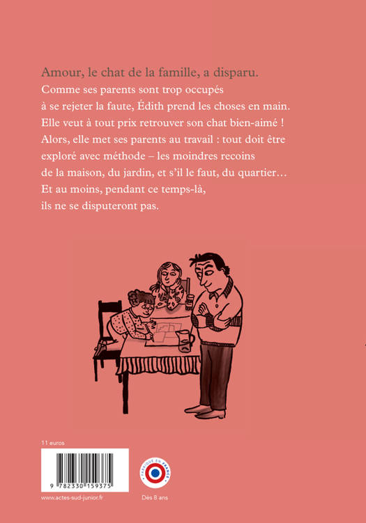 Amour, le chat de la famille, a disparu. Comme ses parents sont trop occupés à se rejeter la faute, Édith prend les choses en main. Elle veut à tout prix retrouver son chat bien-aimé ! Alors, elle met ses parents au travail : tout doit être exploré avec méthode - les moindres recoins de la maison, du jardin, et s'il le faut, du quartier... Et au moins, pendant ce temps-là, ils ne se disputeront pas.