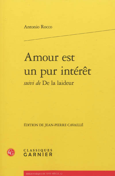 L'amour pur, dégagé de route convoitise, n'existe pas ; l'amour n'est au contraire qu'un pur intérêt. La beauté ne saurait posséder ni utilité, ni agrément, ni honnêteté ; la laideur lui est donc préférable. Amour est un pur intérêt et De la laideur, présentés pour la première fois en français, avec le texte italien en regard, sont deux discours académiques parus à Venise en 1635 d'Antonio Rocco, professeur de philosophie à Venise, membre de l'Academia degli incogniti, auteur du très scandaleux et « libertin » Alcibiade enfant à l'école. Ce sont deux pièces d'éloquence au style vif, chatoyant, plein d'enjouement et d'ironie, mais qui sont aussi, malgré les apparences, deux exercices de philosophie d'une rigueur implacable, aux enjeux considérables.