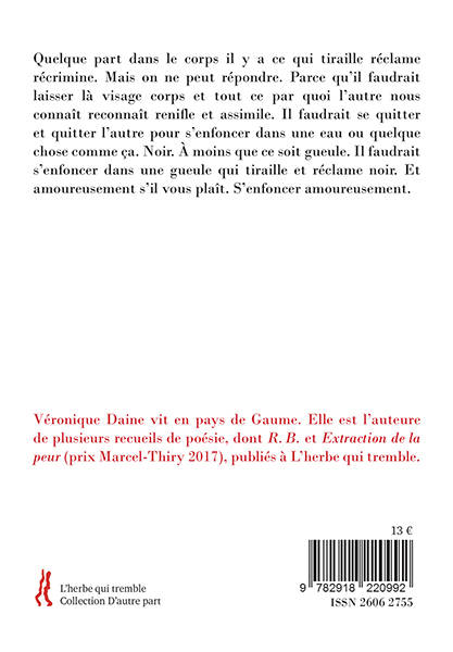 Une suite de poèmes en prose qui tentent d’observer ce qui se passe dans le corps quand on écrit ; le conflit sans merci entre le visage (cette figure composée qu’on propose à autrui, sans quoi l’existence serait invivable) et la gueule (cette « bouche d’ombre » qui parle en soi). Écrire, ce qui s’appelle vraiment écrire, suppose un état de disponibilité auquel on ne s’abandonne pas volontiers parce qu’il implique un ébranlement, une dépossession dont on ne sort pas indemne.