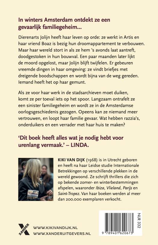 In het winterse Amsterdam van bestsellerauteur Kiki van Dijk, bekend van o.a. de thrillers Vlieland en Parijs, heeft dierenarts Jolijn haar leven op orde: ze werkt in Artis en haar vriend Boaz is bezig hun droomappartement te verbouwen. Maar haar wereld stort in als ze hem ’s avonds laat aantreft, doodgestoken in hun bouwval. Een paar maanden later lijkt de moord opgelost, maar Jolijn blijft twijfelen. Er gebeuren vreemde dingen in haar omgeving: ze vindt briefjes met dreigende boodschappen en wordt bijna van de weg gereden. Iemand heeft het op haar gemunt.