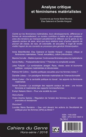 Centré sur les féminismes matérialistes, leurs développements, différences et formes de renouvellement, ce numéro contribue à mettre au jour quelques-unes des tensions qui marquent actuellement la réflexion sur le genre ou les rapports sociaux de sexe, ainsi que leurs relations avec d'autres rapports de pouvoir (de classe, de race, de colonialité, de sexualité). Il s'agit de rendre visible l'apport de ces courants au processus plus général d'émancipation.