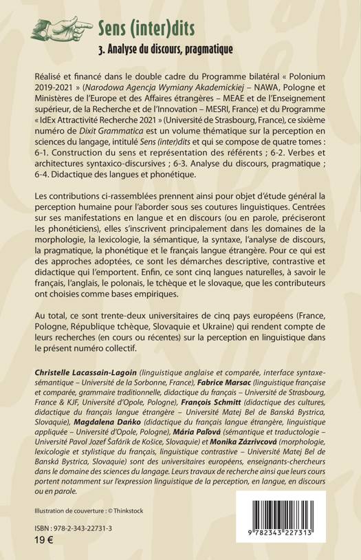 Réalisé et financé dans le double cadre du Programme bilatéral « Polonium 2019-2021 » et du Programme « IdEx Attractivité Recherche 2021» (Université de Strasbourg, France), ce sixième numéro de Dixit Grammatica est un volume thématique sur la perception en sciences du langage, intitulé Sens (inter)dits et qui se compose de quatre tomes : 6-1. Construction du sens et représentation des référents ; 6-2. Verbes et architectures syntaxico-discursives ; 6-3. Analyse du discours, pragmatique ; 6-4. Didactique des langues et phonétique.