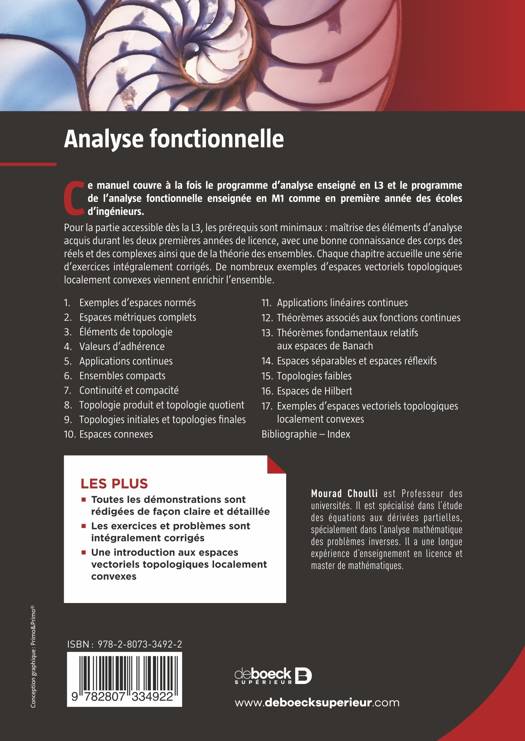 Toute l’Analyse fonctionnelle, avec cours et exercices intégralement corrigés, pour les étudiants en L3 et M1 de mathématiques ainsi que pour les élèves en 1re année des écoles d’ingénieurs.