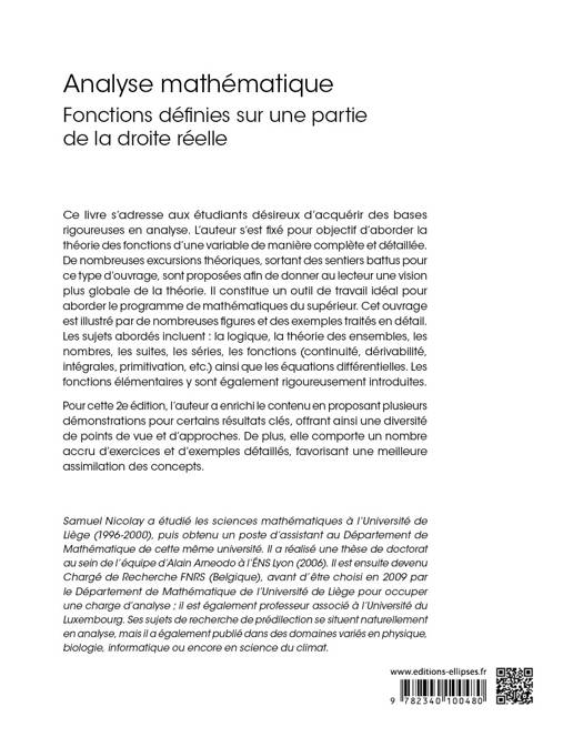 Cet ouvrage est illustré par de nombreuses figures et des exemples traités en détail. Les sujets abordés sont : la logique et la théorie des ensembles, les nombres, les suites, les séries, les fonctions (continuité, dérivabilité, intégrales, primitivation, suite de fonctions, etc.) et les équations différentielles. Les fonctions élémentaires sont également rigoureusement introduites.