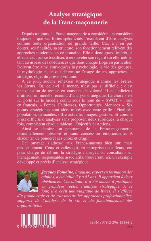 La Franc-maçonnerie a intérêt, si elle ne veut pas se fossiliser, à renouveler son regard sur elle-même. Doivent ainsi être convoquées la psychologie, la vie des groupes, la mythologie et, objet du présent volume, la stratégie. Le modèle d'analyse stratégique proposé par l'auteur porte sur six points : finalités, population, demandes, offre actuelle, images, gestion. Ce panorama de la Franc-maçonnerie sera non seulement utile aux Francs-maçons, mais aussi à ceux qui définissent la stratégie, en entreprise ou ailleurs.