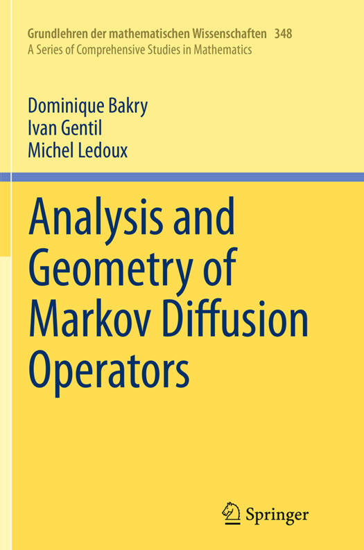 The present volume is an extensive monograph on the analytic and geometric aspects of Markov diffusion operators. It focuses on the geometric curvature properties of the underlying structure in order to study convergence to equilibrium, spectral bounds, functional inequalities such as Poincaré, Sobolev or logarithmic Sobolev inequalities, and various bounds on solutions of evolution equations. At the same time, it covers a large class of evolution and partial differential equations.