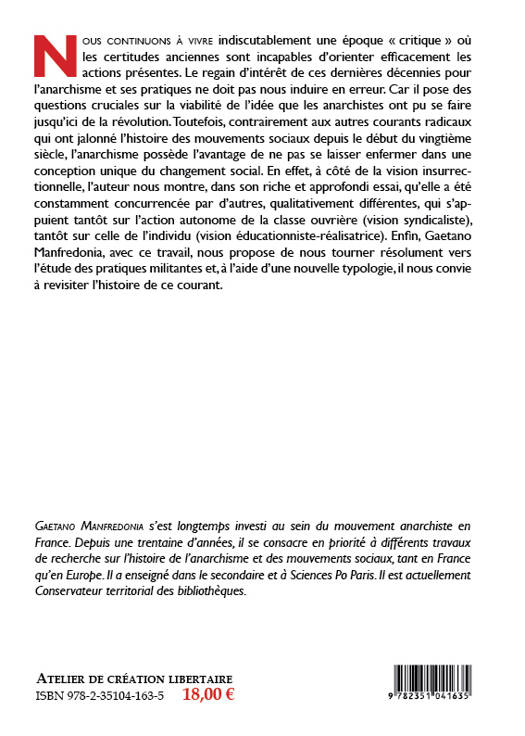 Nous continuons à vivre indiscutablement une époque « critique » où les certitudes anciennes sont incapables d’orienter efficacement les actions présentes. Le regain d’intérêt de ces dernières décennies pour l’anarchisme et ses pratiques ne doit pas nous induire en erreur. Car il pose des questions cruciales sur la viabilité de l’idée que les anarchistes ont pu se faire jusqu’ici de la révolution. Toutefois, contrairement aux autres courants radicaux qui ont jalonné l’histoire des mouvements sociaux depuis le début du vingtième siècle, l’anarchisme possède l’avantage de ne pas se laisser enfermer dans une conception unique du changement social. En effet, à côté de la vision insurrectionnelle, l’auteur nous montre, dans son riche et approfondi essai, qu’elle a été constamment concurrencée par d’autres, qualitativement différentes, qui s’appuient tantôt sur l’action autonome de la classe ouvrière (vision syndicaliste), tantôt sur celle de l’individu (vision éducationniste-réalisatrice). Enfin, Gaetano Manfredonia, avec ce travail, nous propose de nous tourner résolument vers l’étude des pratiques militantes et, à l’aide d’une nouvelle typologie, il nous convie à revisiter l’histoire de ce courant.