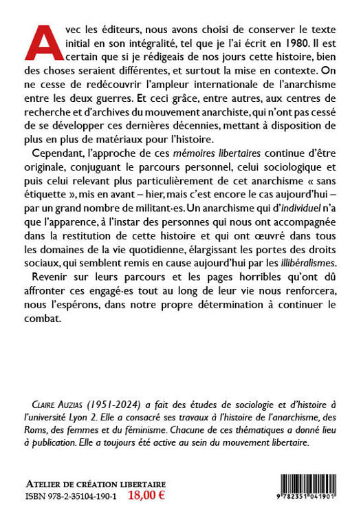 Cependant, l’approche de ces mémoires libertaires continue d’être originale, conjuguant le parcours personnel, celui sociologique et puis celui relevant plus particulièrement de cet anarchisme « sans étiquette », mis en avant – hier, mais c’est encore le cas aujourd’hui – par un grand nombre de militant.es. Un anarchisme qui d’individuel n’a que l’apparence, à l’instar des personnes qui nous ont accompagnée dans la restitution de cette histoire et qui ont œuvré dans tous les domaines de la vie quotidienne, élargissant les portes des droits sociaux, qui semblent remis en cause aujourd’hui par les illibéralismes.