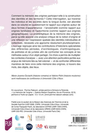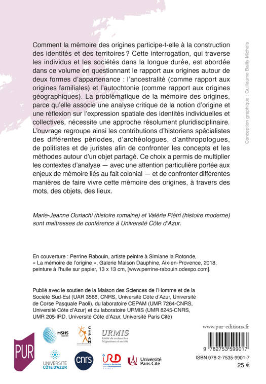 Comment la mémoire des origines participe-t-elle à la construction des identités et des territoires ? Cette interrogation, qui traverse les individus et les sociétés dans la longue durée, est abordée dans ce volume en questionnant le rapport aux origines autour de deux formes d’appartenance : l’ancestralité (comme rapport aux origines familiales) et l’autochtonie (comme rapport aux origines géographiques). La problématique de la mémoire des origines, parce qu’elle associe une analyse critique de la notion d’origine et une réflexion sur l’expression spatiale des identités individuelles et collectives, nécessite une approche résolument pluridisciplinaire. L’ouvrage regroupe ainsi les contributions d’historiens spécialistes des différentes périodes, d’archéologues, d’anthropologues, de politistes et de juristes afin de confronter les concepts et les méthodes autour d’un objet partagé. Ce choix a permis de multiplier les contextes d’analyse — avec une attention particulière portée aux enjeux de mémoire liés au fait colonial — et de confronter différentes manières de faire vivre cette mémoire des origines, à travers des mots, des objets, des lieux.