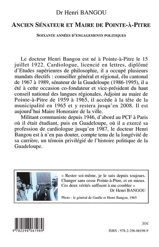 Le docteur Henri Bangou est né à Pointe-à-Pitre le 15 juillet 1922. Cardiologue, il a occupé plusieurs mandats électifs avant de devenir Maire de Pointe-à-Pitre en 1965. Il y restera jusqu'en 2008. Militant communiste depuis 1946, Henri Bangou est, compte tenu de la longévité de sa carrière, un témoin privilégié de l'histoire politique de la Guadeloupe.