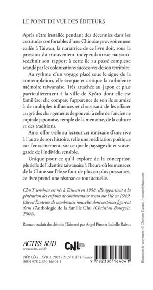 Après s'être installée pendant des décennies dans les certitudes confortables d'une Chinoise provisoirement exilée à Taiwan, la narratrice de ce livre doit, sous la pression du mouvement indépendantiste naissant, redéfinir son rapport à cette île au passé complexe scandé par les colonisations successives de son territoire. Au rythme d'un voyage placé sous le signe de la contemplation, elle évoque et critique la turbulente mémoire taiwanaise. Très attachée au Japon et plus particulièrement à la ville de Kyōto dont elle est familière, elle compare l'apparence de son île soumise à de multiples influences et choisissant de les effacer au gré des changements de pouvoir à celle de l'ancienne capitale japonaise, temple de la mémoire, de la culture et des traditions. Ainsi offre-t-elle au lecteur cet itinéraire d'une rive à l'autre de son histoire, telle une méditation poétique sur l'enracinement, sur ce que le paysage dit et sauvegarde de l'individu sensible. Unique pour ce qu'il explore de la conception plurielle de l'identité taiwanaise à l'heure où les menaces de la Chine sur l'île se font de plus en plus pressantes, ce livre prend une résonance tout actuelle.