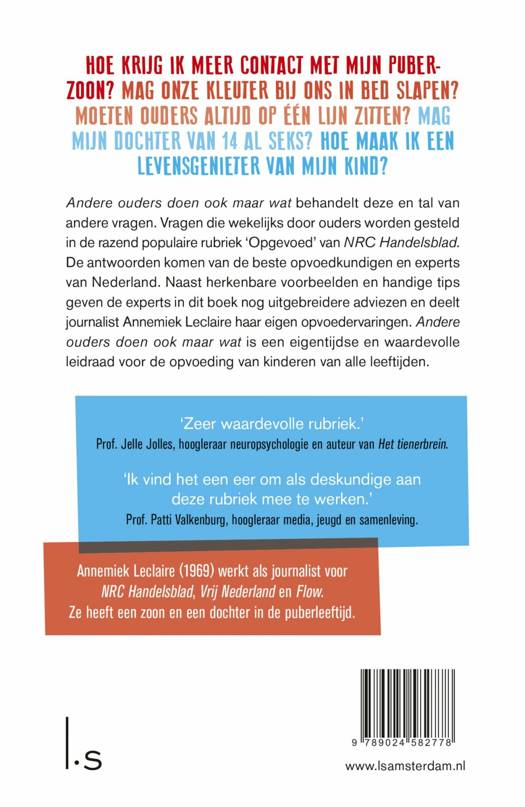 In Andere ouders doen ook maar wat van Annemiek Leclaire worden herkenbare vragen over opvoeden beantwoord door de beste opvoedkundigen van Nederland. Het boek bevat zowel vragen uit de rubriek 'Opgevoed' in het NRC Handelsblad als nieuw materiaal en persoonlijke ervaringen.