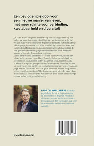 Als Manu Keirse terugkeert naar het dorp van zijn jeugd, merkt hij hoe anders we leven dan vroeger. Gelukkig maar: we zijn een pak vrijer dan vroeger en de vele voordelen van de pijlsnelle medische en technologische vooruitgang spreken voor zich. Maar onze huidige manier van leven eist ook steeds duidelijker zijn tol: oudere mensen hebben het gevoel aan de kant geschoven te worden, jongere mensen branden op en kwetsbare mensen krijgen niet de zorg die ze verdienen. Aan de hand van drie basisthema's – anders ouder worden, anders ziek zijn en anders sterven – gaat Manu Keirse in dit inspirerende boek op zoek naar een fundamenteel andere manier van leven. Hij stelt daarbij prikkelende vragen én geeft genuanceerde antwoorden. Want hoe kunnen we ons leven en onze carrière op een heel andere manier vorm geven, zodat jonge mensen tijd hebben voor hun gezin en oudere mensen volop kansen krijgen om zich te ontplooien? Hoe kunnen we generaties niet naast elkaar, maar met elkaar laten leven? En wat als we de mens en niet de technologie centraal stellen in de gezondheidszorg? 'We leven in een wereld waarin we alles mooi in vakjes hebben opgedeeld: de verantwoordelijkheid voor ouderen is verschoven naar woonzorgcentra en verpleeghuizen, voor ernstig zieken naar professionele zorgverstrekkers in ziekenhuizen, voor sterven en dood naar afdelingen voor intensieve zorg en voor palliatieve zorg, voor de verzorging van overledenen naar uitvaartverzorgers en begrafenisondernemers, voor de rouw van de naasten naar rouwcoaches en rouwtherapeuten. Ik hoop dat ik je in dit boek kan prikkelen om na te denken over een andere manier van leven. Een leven waarin we de schotten tussen de generaties opheffen, waarin kwetsbaarheid een centrale plaats krijgt in plaats van te worden doodgezwegen, waarin de mens in al zijn facetten centraal staat.'