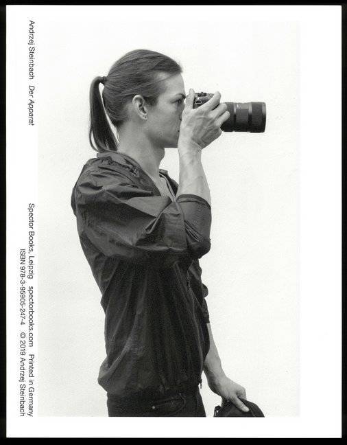 Der Apparat zeigt eine Fotografin beim Fotografieren. Man sieht nicht, was sie festhält, dafür aber jeden einzelnen Schritt, wie sich ihr Blick auf den Gegenstand richtet, wie sich die Kamera zum Körper verhält, wie sich der Körper - der Bewegungsapparat - zum Gegenstand hinwendet. Die gesamte Session ist in einer Laborsituation aufgenommen: Die Figur trägt verschiedene Kleidungsstile - Casual Look und kugelsichere Weste mit Helm. Sie bewegt sich auf einem Büroteppich zwischen quaderförmigen Objekten. Es werden verschiedene Orte und Szenarien mit unterschiedlichen Bedeutungen simuliert. Während es in den vorherigen Serien Figur I, Figur II und Gesellschaft beginnt mit drei mehr um die Erscheinung selbst, die Frage nach Lesbarkeit von Zeichen, Gesten und um die Beziehungen zwischen den Figuren ging, steht in Der Apparat eine Handlung mit Figur im Vordergrund. Es ist der dritte und vorerst letzte Teil der Portrait-Reihe von Andrzej Steinbach.