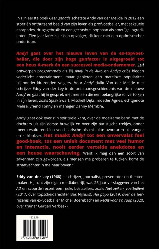 In zijn eerste boek Geen genade schetste Andy van der Meijde in 2012 een stoer én onthutsend beeld van zijn leven als profvoetballer, met seksuele escapades, drugsgebruik en een gecrashte loopbaan als smeuïge ingrediënten. Tien jaar later is er een opvolger, dit keer met een optimistischer ondertoon. Andy! gaat over het nieuwe leven van de ex-topvoetballer, die door zijn hoge gunfactor is uitgegroeid tot een heus A-merk én een succesvol media-ondernemer. Zelf ontworpen (online-)programma's als Bij Andy in de Auto en Andy's cribs bieden vederlicht entertainment, maar genieten een mateloze populariteit bij honderdduizenden volgers. Voor Andy! duikt Van der Meijde met schrijver Eddy van der Ley in de ontstaansgeschiedenis van de 'nieuwe Andy' en gaat hij in gesprek met mensen die een belangrijke rol vertolken in zijn leven, zoals Sjaak Swart, Mitchell Dijks, moeder Agnes, echtgenote Melisa, vriend Tonny en manager Danny. Andy! gaat ook over zijn spirituele kant, over de moeizame band met de dochters uit zijn eerste huwelijk en over zijn autistische trekjes, onder meer resulterend in even hilarische als mislukte avonturen als zanger en kickbokser. Het maakt Andy! tot een onvervalst feel good-boek in sombere corona-tijden, tot een uniek document met veel humor en interactie, nooit eerder vertelde anekdotes en een heuse waarschuwing. 'Want ik mag dan een soort van zakenman zijn geworden, als mensen me proberen te fucken, komt de straatvechter in me naar boven.'
