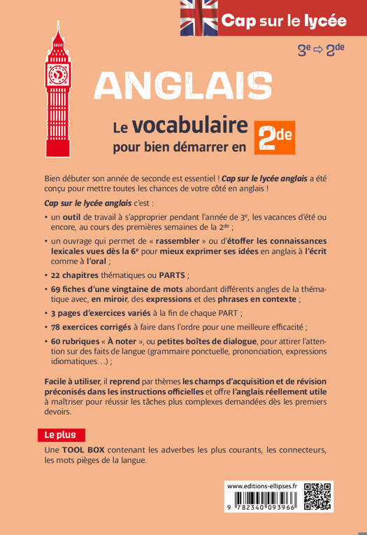 Outil de travail à s’approprier pendant l’année de 3e, les vacances d’été ou au début de la 2de, il permet de « rassembler » ou d’étoffer les connaissances vues dès la 6e et ainsi, d’être en mesure de mieux exprimer ses idées en anglais à l’oral comme à l’écrit.