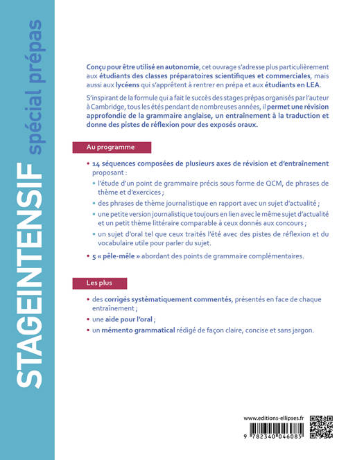 S’inspirant de la formule qui a fait le succès des stages prépas organisés par l’auteur à Cambridge, tous les étés pendant plusieurs années, il permetune révision approfondie de la grammaire anglaise, un entraînement à la traduction et donne des pistes de réflexion pour des exposés oraux.
