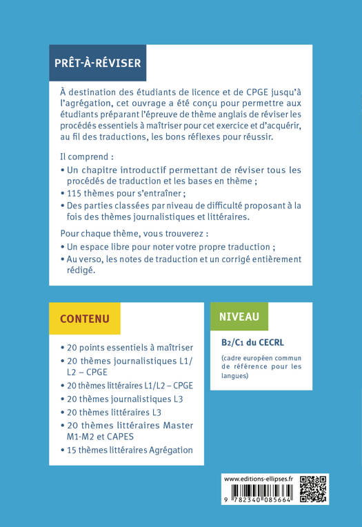 À destination des élèves de classes préparatoires aux grandes écoles, des étudiants du supérieur et des candidats au CAPES ou à l’Agrégation d’anglais cet ouvrage d’entraînement gradué au thème anglais a été conçu pour permettre de réviser et de maîtriser cet exercice.