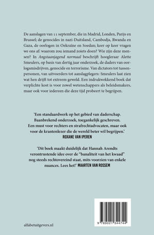 De aanslagen van 11 september, die in Madrid, Londen, Parijs en Brussel; de genocides in nazi-Duitsland, Cambodja en Rwanda; de oorlogen in Oekraïne en Gaza; keer op keer vragen we ons af: waarom zou iemand zoiets doen? Wie zijn deze mensen? In Angstaanjagend normaal beschrijft hoogleraar Alette Smeulers, op basis van dertig jaar onderzoek, de daders van oorlogsmisdrijven, genocide en terrorisme. Van dictators tot tussenpersonen, van uitvoerders tot aanslagplegers: Smeulers laat zien wat hen drijft tot extreem geweld. Een indrukwekkend boek dat verplichte kost is voor zowel wetenschappers als beleidsmakers, maar ook voor iedereen die deze tijd probeert te begrijpen.