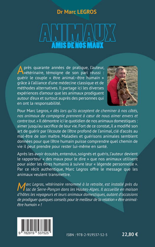 Après quarante années de pratique, l’auteur, vétérinaire, témoigne de son pari réussi : guérir le couple "être animal - être humain" grâce à l’alliance d’une médecine classique et de méthodes alternatives. Il partage ici les diverses expériences d’amour que les animaux prodiguent autour d’eux et surtout auprès des personnes qui en ont la responsabilité. Pour Marc Legros, "dès lors qu’ils acceptent de cheminer à nos côtés, nos animaux de compagnie prennent à cœur de nous aimer envers et contre tout." Il démontre ici le quotidien de nos animaux domestiques : aimer jusqu’au sacrifice de leur vie. Fort de ce constat, il a modifié son art de guérir par l’écoute de l’être profond de l’animal, porte d’accès au mal-être de son maître. Maladies et guérisons animales semblent données pour que l’être humain comprenne quel chemin de vie il peut prendre pour rester lui-même en santé. Après les avoir écoutés, entendus, soignés et guéris, l’auteur devient le rapporteur « des maux pour le dire » que nos animaux utilisent pour aider les humains à suivre leur « légende personnelle ». Par ce récit authentique, Marc Legros offre le message que les animaux veulent transmettre.