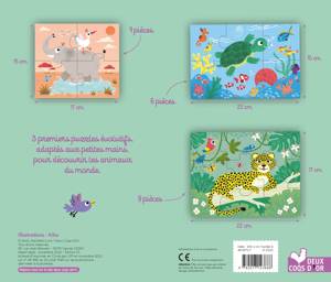 Une boîte avec 3 puzzles de 3 niveaux de difficultés différents Puzzle 4 pièces : 17x15 cm (dimensions d'une pièce : 7,5x8,5cm) Puzzle 6 pièces : 15x22 cm (dimensions d'une pièce : 7,5x7,5cm) Puzzle 9 pièces : 17x22 cm (dimensions d'une pièce : 7,5x5,5cm) Avec des pièces robustes pour les petites mains