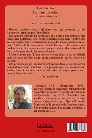 Quelque chose est sur le point de s'effondrer, d'être consumé par le feu, emporté par l'inondation. Amours décadents, pères terribles, mères manipulatrices, rongeurs respirant dans l'ombre et voisins qui mènent leur vie de l'autre côté des murs, un groupe de gamins avec un 32, un idiot de chaque côté de leur mère, des membres amputés douloureux, des travestis avec un petit chien, des artistes de la faim et des portraits des femmes endormies. L'eau emporte tout. L'eau qui court entre les deux pays, qui tombe sur les rues de Sao Paulo et celles de Montevideo, qui nettoie et dévaste tout. Les personnages de Gonzalo Baz continuent à vous tourner dans la tête dès qu'on a refermé son livre. Il vous arrive d'écouter une samba, de fumer machinalement ou d'entendre un vague et très lointain grondement qui retentit dans la nuit. (De la préface de Horacio Cavallo) En 2021, G. Baz a été choisi par la prestigieuse revue Granta parmi les meileurs ecrivains en langue espagnole de moins de 35 ans.