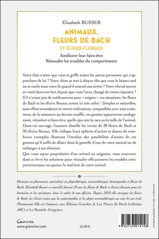 Votre chat n’aime que vous et griffe toutes les autres personnes qui s’approchent de lui ? Votre chien se met à aboyer dès que vous le laissez seul ou se cache sous votre lit quand il entend une sirène ? Votre cheval tourne en rond dans son box depuis que vous l’avez changé de centre équestre ? S’il n’existe pas de médicaments pour « soigner » ces situations, les fleurs de Bach et les élixirs floraux seront ici très utiles ! Simples et naturelles, sans effets secondaires ni contre-indications, compatibles avec tout traitement, de la naissance au dernier souffle, ces gouttes apporteront soulagement, réconfort et bien-être, quelle que soit la race ou la taille de l’animal. Dans cet ouvrage, l’auteure détaille les vertus de 38 fleurs de Bach et 30 élixirs floraux. Elle indique leurs sphères d’action et donne de nombreux exemples illustrant l’étendue des possibilités de ces gouttes qu’il suffit de diluer dans la gamelle d’eau de votre animal ou de mélanger à ses aliments. Que vous soyez propriétaire d’un animal ou soignant, vous trouverez dans ce livre les solutions pour résoudre efficacement ses troubles comportementaux ou apaiser son mal-être.