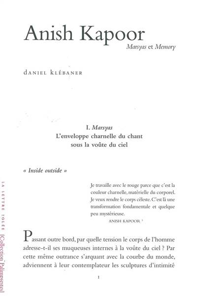 Passant outre bord, par quelle tension le corps de l'homme adresse-t-il ses muqueuses internes à la voûte du ciel ? Méditation poétique et critique sur deux oeuvres majeures d'Anish Kapoor, Marsyas et Memory, cet essai littéraire est ponctué par « séquences » ou « fusées » au sens baudelairien du terme. D'où le propos rayonne vers d'autres réalisations de l'artiste. Le chant, le souffle, l'espace sacrificiel, la mémoire rendent sensible ce que l'oeuvre de Kapoor nous fait connaître de la condition humaine. Sous-tendu par des liens à la source hindouiste, une des racines d'Anish Kapoor, l'écrit de Daniel Klébaner est étayé par des analyses critiques liées à l'histoire de l'art, une mise en regard du Marsyas de Kapoor avec le Supplice de Marsyas du Titien, par exemple, ou une réflexion sur le monochrome et la couleur, convoquant Yves Klein, Morris Louis...