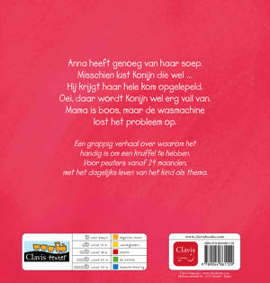 Anna heeft genoeg van haar soep. Misschien lust Konijn die wel … Hij krijgt haar hele bordje opgelepeld. Oei, daar wordt Konijn wel erg vuil van. Mama is boos, maar de wasmachine lost het probleem op.