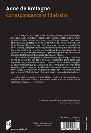 Cet ouvrage est une ample publication de sources sur Anne de Bretagne, dont beaucoup sont inédites : toute la correspondance retrouvée (active et passive, de la duchesse et de la reine) complétée par plusieurs documents fondamentaux. La datation des missives restitue le contexte historique et l'identification des personnages informe sur les réseaux personnels de la reine. En outre, la reconstitution de ses nombreuses pérégrinations démontre la grande mobilité de cette femme, révélatrices de son tempérament et de ses motivations : une extrême énergie, la piété et les pèlerinages et un amour conjugal dont témoignent aussi les ambassadeurs italiens.