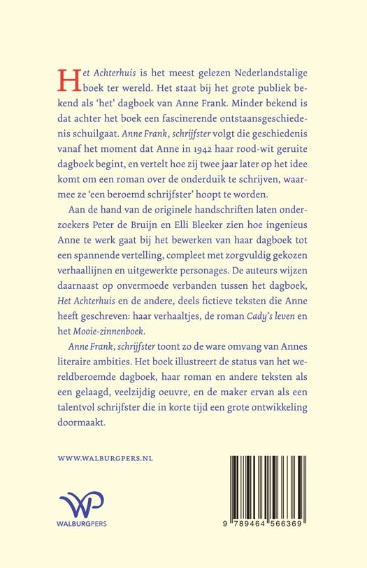 'Anne Frank, schrijfster' toont zo de ware omvang van Annes literaire ambities. Het boek illustreert de status van het wereldberoemde dagboek, haar roman en andere teksten als een gelaagd, veelzijdig oeuvre, en de maker ervan als een talentvol schrijfster die in korte tijd een grote ontwikkeling doormaakt.