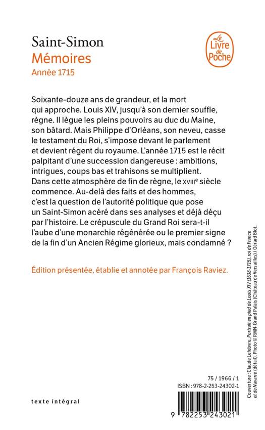 Soixante-douze ans de grandeur, et la mort qui approche. Louis XIV, jusqu’à son dernier souffle, règne. Il lègue les pleins pouvoirs au duc du Maine, son bâtard. Mais Philippe d’Orléans, son neveu, casse le testament du Roi, s’impose devant le parlement et devient régent du royaume. L’année 1715 est le récit palpitant d’une succession dangereuse : ambitions, intrigues, coups bas et trahisons se multiplient. Dans cette atmosphère de fin de règne, le XVIIIe siècle commence. Au-delà des faits et des hommes, c’est la question de l’autorité politique que pose un Saint-Simon acéré dans ses analyses et déjà déçu par l’histoire. Le crépuscule du Grand Roi sera-t-il l’aube d’une monarchie régénérée ou le premier signe de la fin d’un Ancien Régime glorieux, mais condamné ?