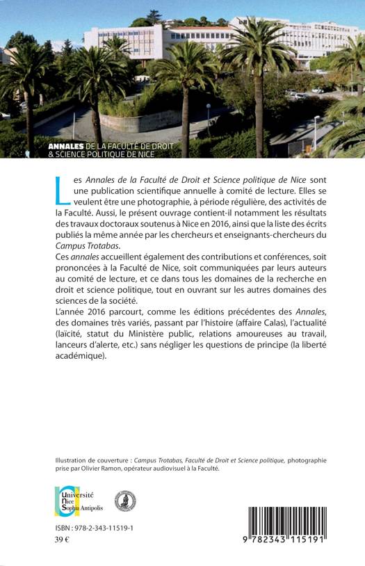 Comme les éditions précédentes, ces annales de l'année 2016 parcourent des domaines très variés passant par l'histoire (affaire Calas), l'actualité (laïcité, statut du Ministère public, relations amoureuses au travail, lanceur d'alerte etc.) sans négliger les questions de principe (la liberté académique).