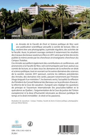 L'année 2017 parcourt, comme les éditions précédentes, des domaines très variés, passant notamment de l'histoire (Hugo briguait-il un ministère ? ; les bonnets verts), l'actualité (la réflexion du Président du Conseil National des Barreaux sur la profession d'avocat ; la réforme de la Cour de cassation ; Europol) sans négliger les questions de principe et l'ouverture internationale (les poursuites-bâillon et la quérulence au Québec ; l'argumentation de la Cour de justice de l'Union européenne) ni la dose d'humanité nécessaire au discours juridique (le temps et le droit immobilier ; le droit et les passions).