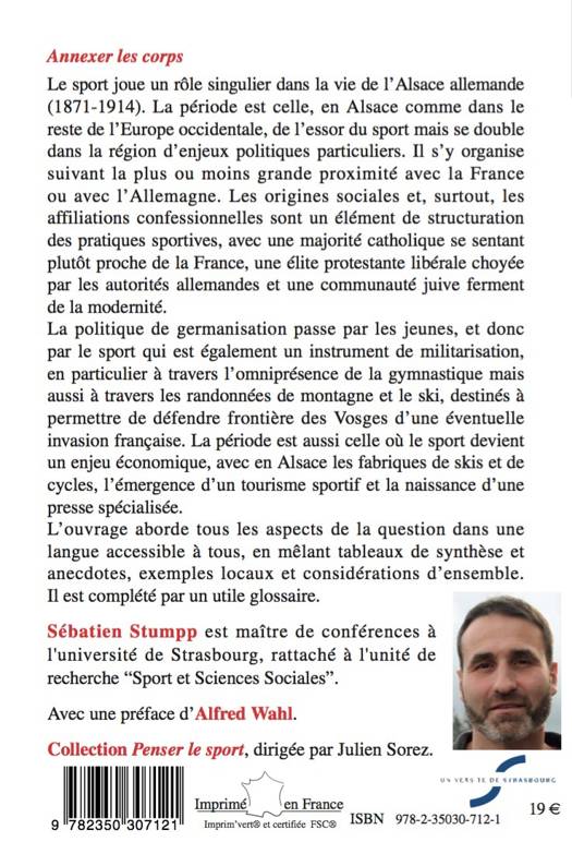 Le sport joue un rôle singulier dans la vie de l’Alsace allemande (1871-1914). La période est celle, en Alsace comme dans le reste de l’Europe occidentale, de l’essor du sport mais se double dans la région d’enjeux politiques particuliers. Comme partout, le sport est un marqueur social qui distingue les classes sociales. En Alsace, il s’organise suivant la plus ou moins grande proximité avec la France ou avec l’Allemagne, depuis les sociétés sportives ouvertement francophiles jusqu’aux immigrés d’Allemagne, qui représentent 10 % de la population de la région et 30 % de celle de Strasbourg. Les affiliations confessionnelles sont également un élément de structuration des pratiques sportives, avec une majorité catholique se sentant proche de la France, une élite protestante libérale choyée par l’occupant et une communauté juive ferment de la modernité. La période est aussi celle où le sport devient un enjeu économique, avec en Alsace les fabriques de skis et de cycles, l’émergence d’un tourisme sportif et la naissance d’une presse spécialisée. Politiquement, on peut distinguer trois périodes : jusqu’en 1887 où l’occupant affronte assez frontalement les organisations sportives refuges de la proximité avec la France, à partir de 1908 quand celles-ci sont à nouveau autorisées à se développer, ce qui permet au mouvement protestataire de s'épanouir, et entre les deux où le Reich mène sans heurts majeurs une patiente politique de germanisation. Celle-ci passe par les jeunes, et donc par le sport qui est également un instrument de militarisation, en particulier à travers l’omniprésence de la gymnastique mais aussi à travers le ski, destiné à permettre de défendre la ligne bleue des Vosges d’une éventuelle invasion française. L’ouvrage aborde tous les aspects de la question dans une langue accessible à tous, en mêlant tableaux de synthèse et anecdotes, exemples locaux et considérations d’ensemble. Il est complété par un utile glossaire.