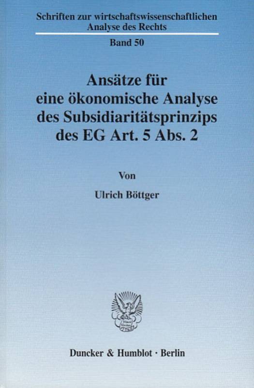Das Subsidiaritätsprinzip des EG Art. 5 Abs. 2 wird mit Hilfe des ökonomischen Instrumentariums der ökonomischen Analyse des Rechts mit dem Ziel untersucht, zu einer Konkretisierung zu gelangen, die der juristischen Anwendung dieser Norm als Kompetenzbegrenzungsregel dient. Es soll ein Modell für eine ökonomische Analyse der Kompetenzausübung entwickelt werden. Hierzu entwirft Ulrich Böttger einen komplexen interdisziplinären Ansatz, eine positive Ökonomik im Rahmen der (neuen) Institutionenökonomik. Das Modell wird aus einer Synthese von Property-Rights-Ansatz und Transaktionskostentheorie im Subsidiaritätsprinzip entwickelt. Der Autor arbeitet die Schwächen und offenen Fragen, insbesondere die Unbestimmtheit des Subsidiaritätsprinzips, heraus.