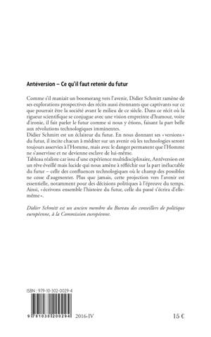 Comme s'il lançait un boomerang vers l'avenir, Didier Schmitt ramène de ses explorations prospectives des récits aussi étonnants que captivants sur ce que pourrait être la société avant le milieu de ce siècle. Dans ce récit où la rigueur scientifique se conjugue avec une vision empreinte d'humour, voire d'ironie, il fait parler le futur comme si nous y étions, faisant la part belle aux révolutions technologiques imminentes. Tableau réaliste car issu d'une expérience multidisciplinaire, Antéversion est un rêve éveillé mais lucide qui nous amène à réfléchir sur la part inéluctable du futur - celle des confluences technologiques où le champ des possibles ne cesse d'augmenter.