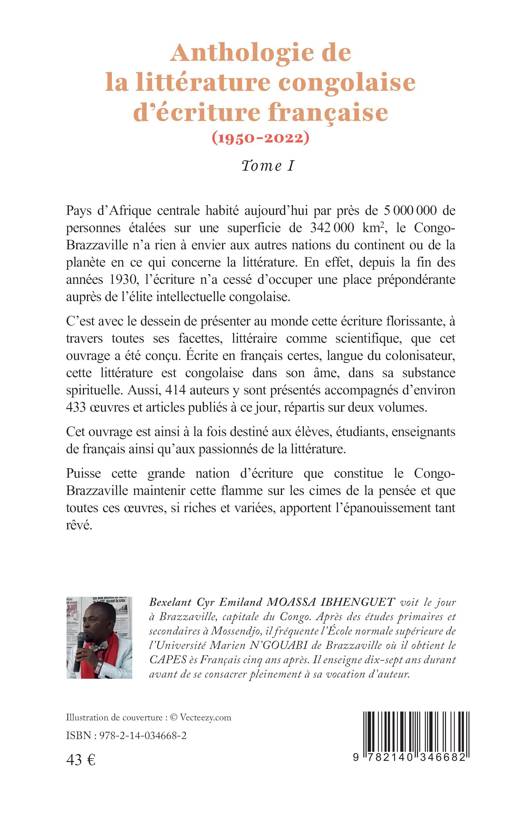 Pays d'Afrique centrale habité aujourd'hui par près de 5 000 000 de personnes étalées sur une superficie de 342 000 km2, le Congo-Brazzaville n'a rien à envier aux autres nations du continent ou de la planète en ce qui concerne la littérature. En effet, depuis la fin des années 1930, l'écriture n'a cessé d'occuper une place prépondérante auprès de l'élite intellectuelle congolaise. C'est avec le dessein de présenter au monde cette écriture florissante, à travers toutes ses facettes, littéraire comme scientifique, que cet ouvrage a été conçu. Écrite en français certes, langue du colonisateur, cette littérature est congolaise dans son âme, dans sa substance spirituelle. Aussi, 414 auteurs y sont présentés accompagnés d'environ 433 oeuvres et articles publiés à ce jour, répartis sur deux volumes. Cet ouvrage est ainsi à la fois destiné aux élèves, étudiants, enseignants de français ainsi qu'aux passionnés de la littérature. Puisse cette grande nation d'écriture que constitue le Congo-Brazzaville maintenir cette flamme sur les cimes de la pensée et que toutes ces oeuvres, si riches et variées, apportent l'épanouissement tant rêvé.