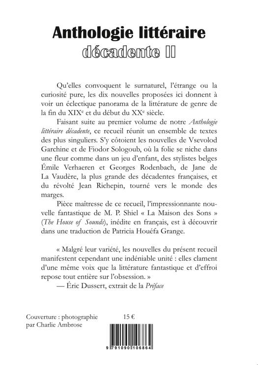 Qu’elles convoquent le surnaturel, l’étrange ou la curiosité pure, les dix nouvelles réunies ici donnent à voir un éclectique panorama de la littérature de genre de la fin du XIXe et du début du XXe siècle. Faisant suite au premier volume de notre Anthologie littéraire décadente, ce recueil propose un ensemble de textes singuliers. S’y côtoient les nouvelles de Vsevolod Garchine et de Fiodor Sologoub, où la folie se niche dans une fleur comme dans un jeu d’enfant, des stylistes belges Émile Verhaeren et Georges Rodenbach, de Jane de La Vaudère, la plus grande des décadentes françaises, et du révolté Jean Richepin, toujours tourné vers le monde des marges. Pièce maîtresse de ce recueil, l’impressionnante nouvelle fantastique de M. P. Shiel « La Maison des Sons », inédite en français, est à découvrir dans une traduction de Patricia Houéfa Grange.