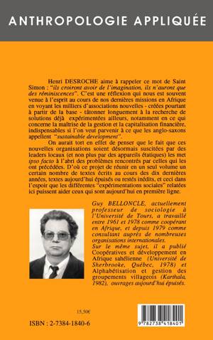 Henri DESROCHE aime à rappeler ce mot de Saint Simon: "ils croiront avoir de l'imagination, ils n'auront que des réminiscences". C'est une réflexion qui nous est souvent venue à l'esprit au cours de nos dernières missions en Afrique en voyant les milliers d'associations nouvelles - créées pourtant à partir de la base - tâtonner longuement à la recherche de solutions déjà expérimentées ailleurs, notamment en ce qui concerne la maîtrise de la gestion et la capitalisation financière, indispensables si l'on veut parvenir à ce que les anglo-saxons appellent "sustainable development". On aurait tort en effet de penser que le fait que ces nouvelles organisations soient désormais suscitées par des leaders locaux (et non plus par des appareils étatiques) les met ipso facto à 1' abri des problèmes rencontrés par celles qui les ont précédées. D'où ce projet de réunir en un seul volume un certain nombre de textes écrits au cours des dix dernières années, textes aujourd'hui épuisés ou restés inédits, et ceci dans 1 'espoir que les différentes "expérimentations sociales" relatées ici puissent aider ceux qui sont aujourd'hui en première ligne.