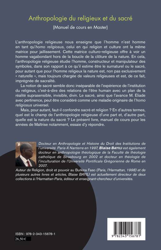 L'anthropologie religieuse nous enseigne que l'homme n'est homme en tant qu'homo religiosus, celui en qui religion et culture ont la même matrice pour jaillissement. Faut-il confondre sacré et religion ? En d'autres termes, quel est le champ de l'anthropologie religieuse d'une part et, d'autre part, quelle est la nature du sacré ? Le présent livre, manuel de cours pour les années de maitrise notamment, essaie d'y répondre