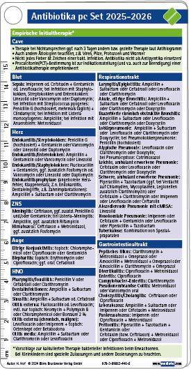 Das Antibiotika pocketcard Set 2025-2026 informiert übersichtlich über die aktuellen Empfehlungen zur empirischen Initialtherapie und der jeweiligen erregerspezifischen Folgetherapie: -Nach Organsystemen gegliederte Darstellung der häufigsten Infektionen und ihrer jeweiligen empirischen Initialtherapie. -Tabellarisches, nach Erregern gegliedertes Aktivitätsspektrum der Antibiotika mit Medikamentenbeispielen und den jeweiligen Dosierungen